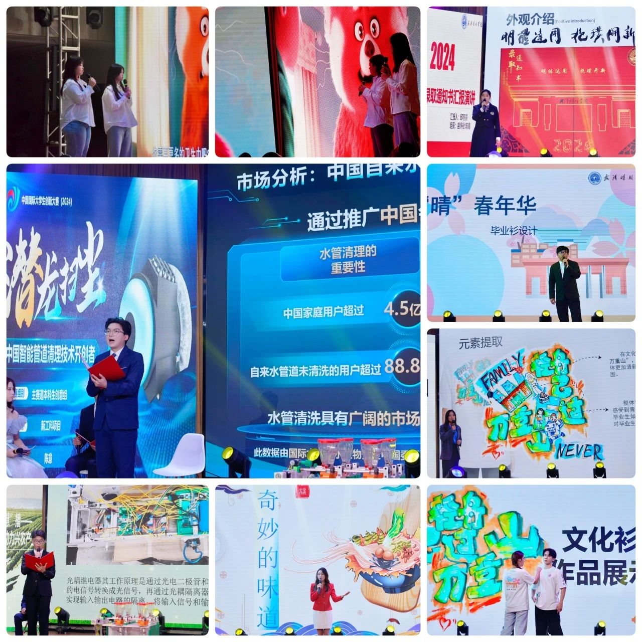 第二篇章“青锐新创”,紧密结合各学院专业特色,通过“挑战杯”校赛、多语种配音大赛、LED电子设计大赛、创意LOGO设计大赛、金话筒主持人大赛、成图技术建模大赛、程序设计大赛等学科竞赛,助力青年学子创新能力培养的各类学科专业成果进行汇演。英文配音《青春变形记》、“挑战杯”获奖项目展示、环保设计作品展示、演讲《奇妙的味道》,彰显了青年学子在各自的领域中积极探索、勇于创新的精神风貌。