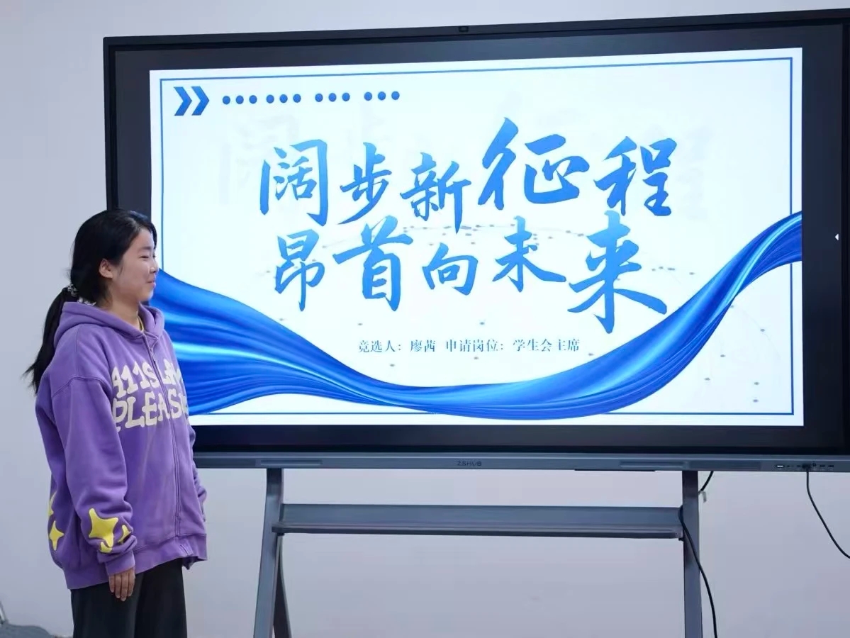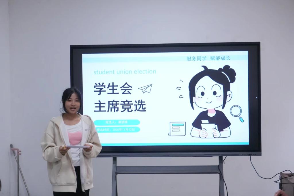 接着上场的是廖茜同学,她以“共开新篇,同赴新程”为目标,聚焦“常规工作具体化、活动形式创新化”,立志以服务倾听同学需求,优化活动形式,推出更亮眼的活动。接着上场的是杨茹嫣同学,她表示要将热爱转化为服务热情,强调“团队力量大于个人”以及要把“同学需求放在第一位”作为工作底色,尽显温暖与责任。随后上场的是潘望娣同学,她着眼“学生反馈畅通”与“内部破冰”,以热情与责任为底色,立志搭建更高效的服务桥梁。