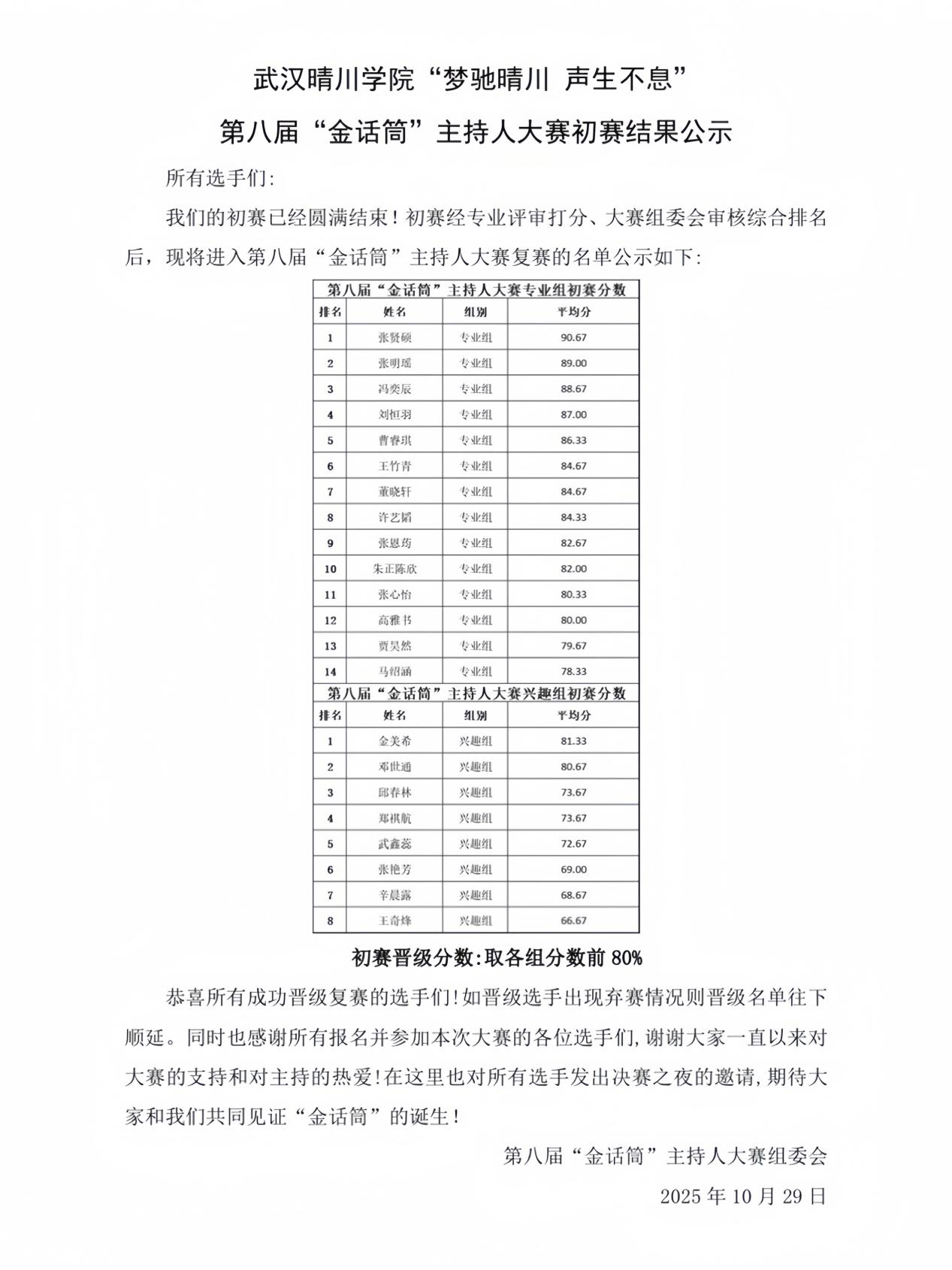 祝贺所有晋级的选手,期待大家在复赛中更加精彩的表现。同时感谢每一位选手对比赛热情参与,这里不会是终点,而是努力的起点。期待大家继续闪闪发光,熠熠生辉!