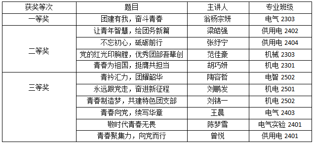 舞台上的每一个团支部都带着独属于他们的光芒,那些朴实无华的故事在舞台上徐徐展开,赢得阵阵掌声,他们用自己的努力让我们深刻感受到“悦青春,悦成长”的深刻内涵。最终电气2303、供用电2402等11个团支部分获一、二、三等奖。