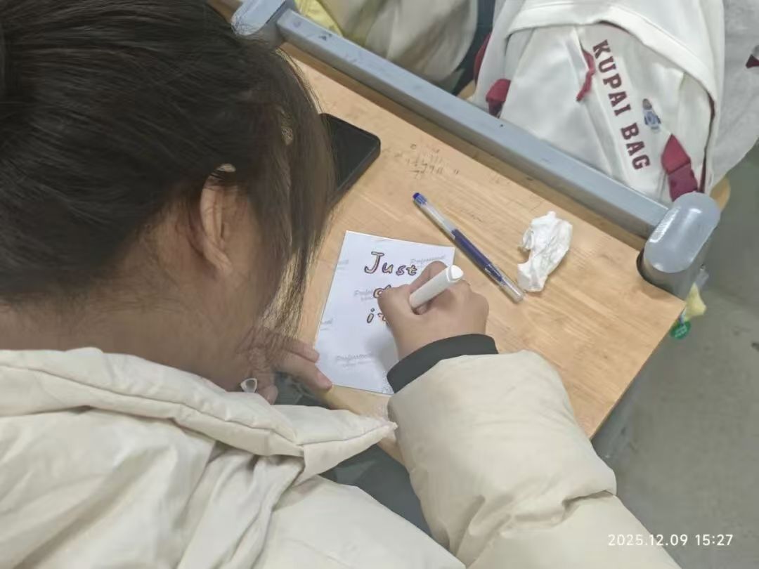 活动伊始,“时光序言”环节拉开帷幕。同学们手持打印好的校园生活照片,一张张鲜活的画面唤醒了藏在时光里的点滴回忆。大家借着这份温暖的底色,提笔在照片背面写下对未来的憧憬与期盼。一笔一划,都是此刻最纯粹的热忱与懵懂,悉数藏进字里行间。