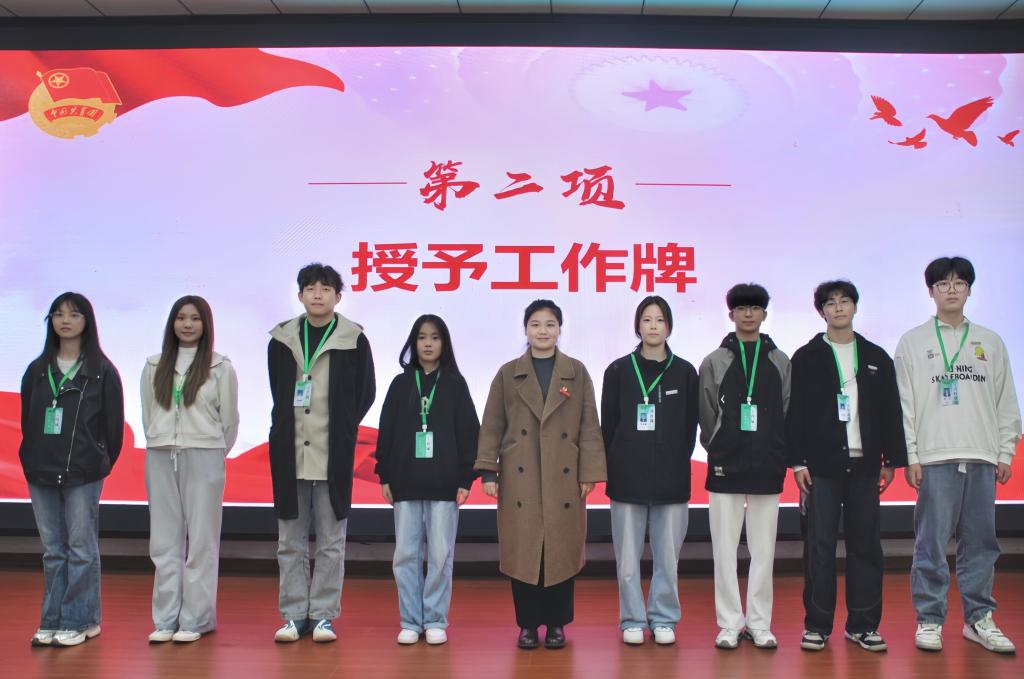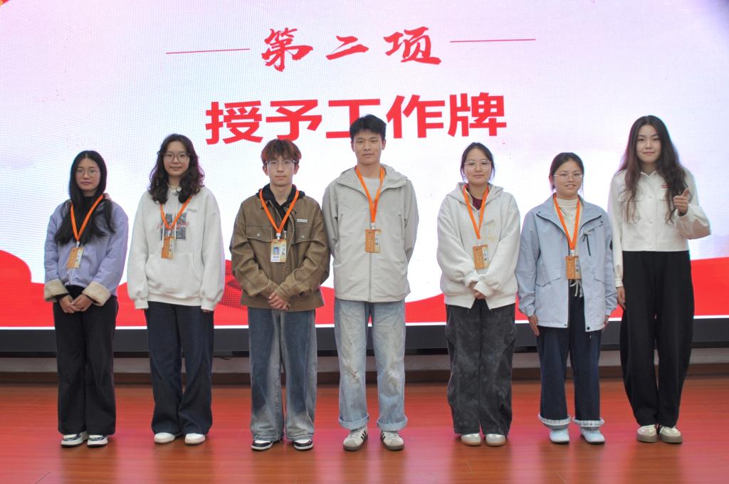 会上,校团委老师陈江南、校团委老师许雅慧、校团委老师卢嘉豪分别为校队代表、校学生会干部代表和校团委团属职能部门干部代表进行工作牌授予仪式。