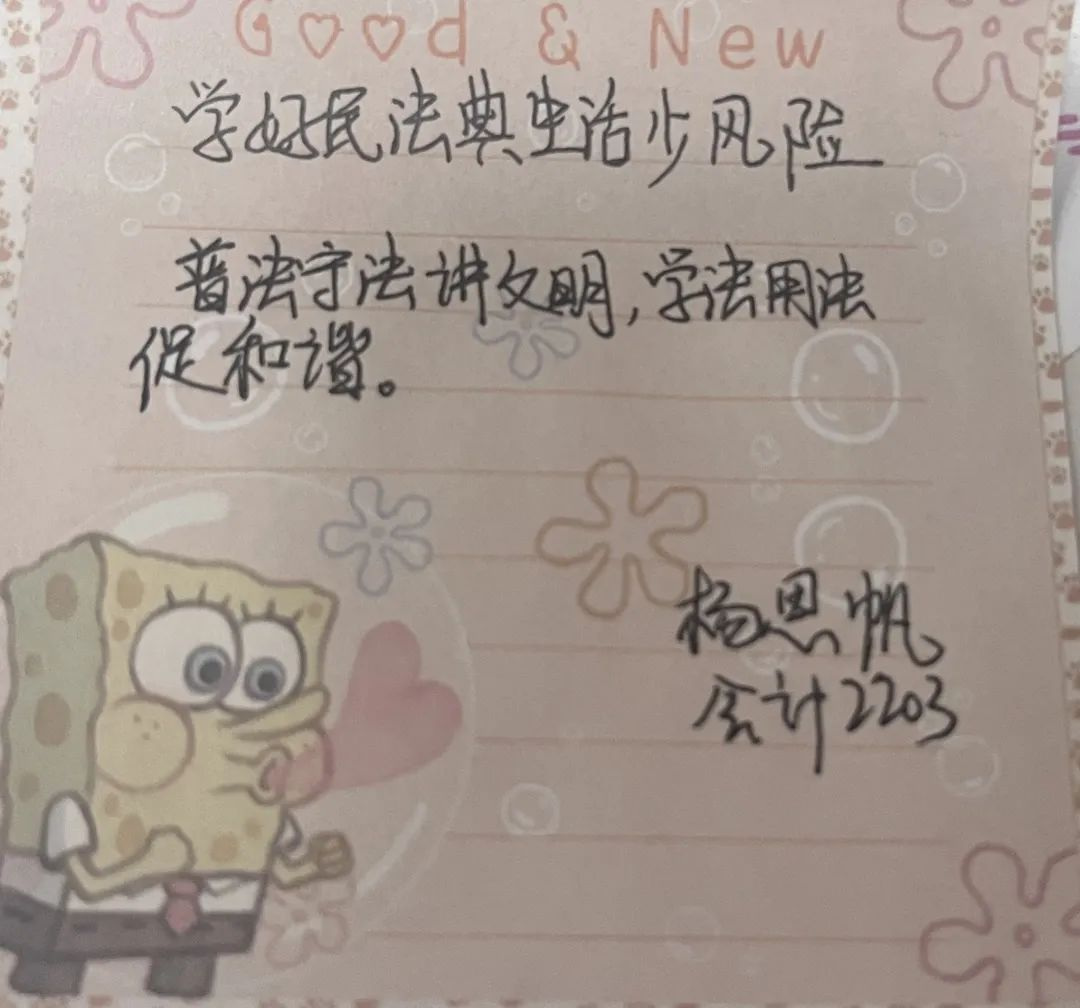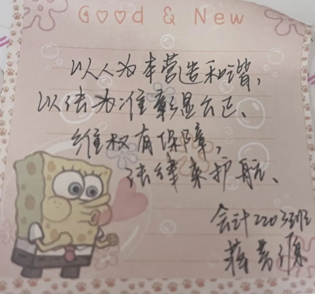 活动第三项,通过观看生动的视频让同学们更加理解了“法律伴生活”的重要性,同学们用文字表达了自己对法律的敬畏之心。