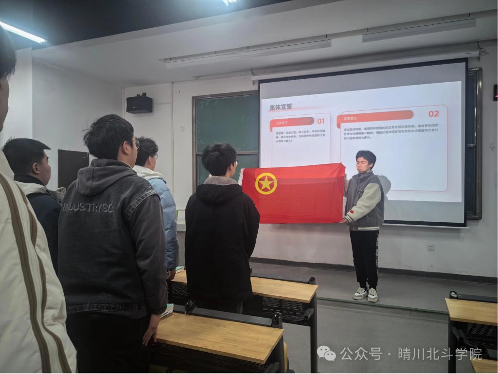 活动的最后,全体同学面对团旗,庄严宣誓:“铭记历史,捍卫和平,传承抗战精神,肩负青年使命,为实现中华民族伟大复兴而努力奋斗!”宣誓声洪亮而坚定,表达了同学们对先辈深深的敬意。