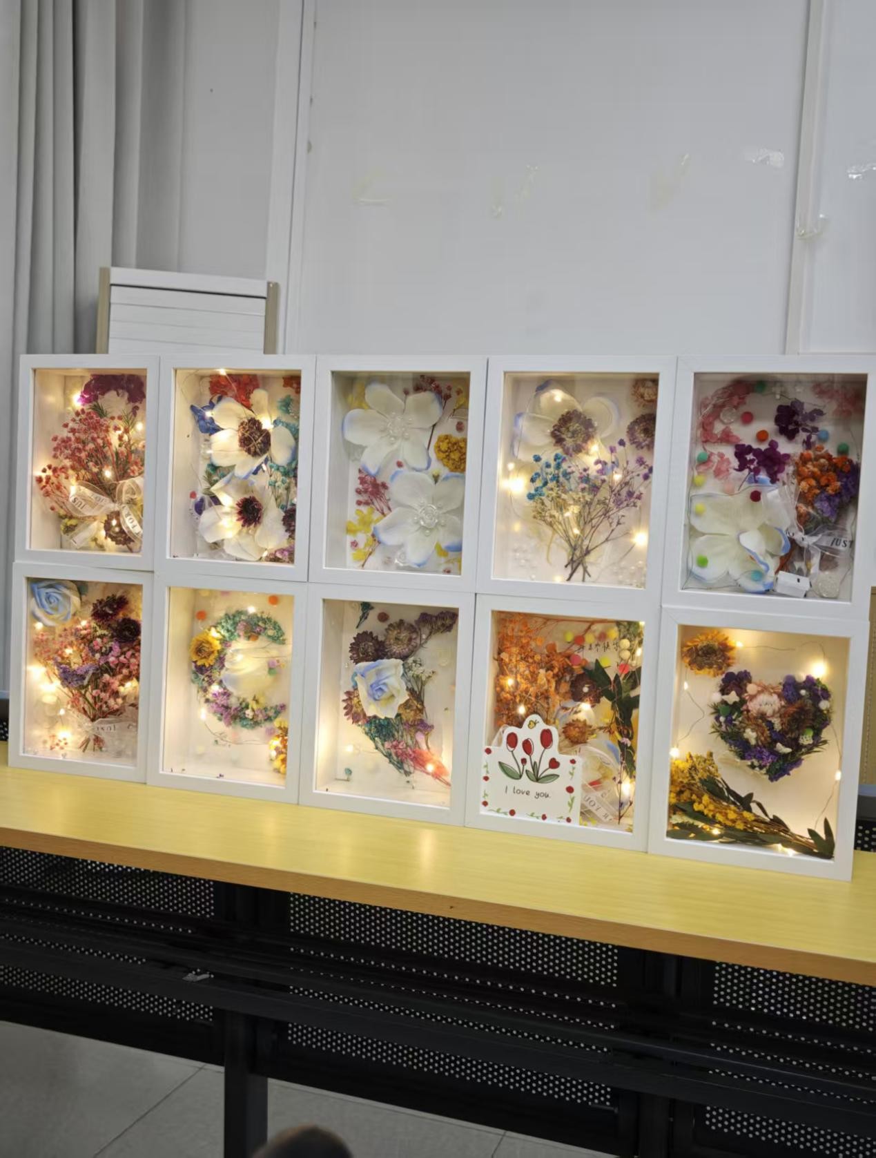 活动讲解结束后,班级进入手工实践环节。课桌上摆满了永生花、彩色装饰球、丝带等材料,同学们化身"手作达人",精心设计独一无二的母亲节礼物。有的用白蓝玫瑰与紫色干花拼出爱心图案,有的为相框点缀暖黄色小灯串,还有的将写有"I LOVE YOU"的贺卡悄悄藏在花束间。蓝白渐变的玫瑰、粉色的满天星、珍珠装饰、丝带……每一份作品都凝聚着细腻的巧思。最终,十份永生花相框在桌面上整齐陈列,灯光映照下宛如繁星,象征着对母亲永不凋谢的爱。同学们提笔书写的贺卡,让简单的纸张承载了最深沉的告白。