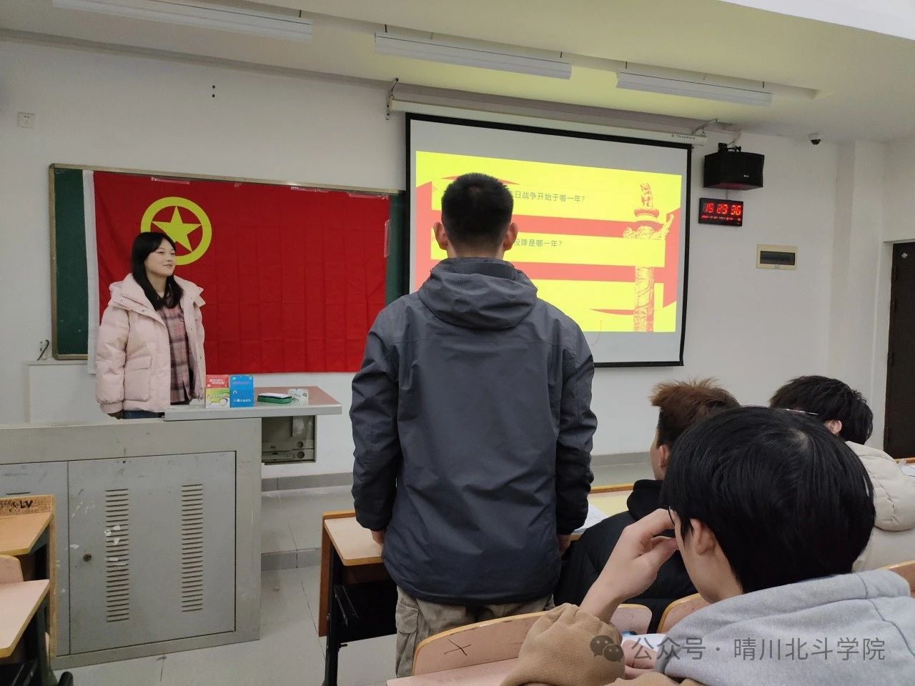 首先,我班团支书王淼婷为我们讲述了中国人民抗日战争纪念日时间修改的这一事实,并对接下来要讲的事情做了相关介绍。