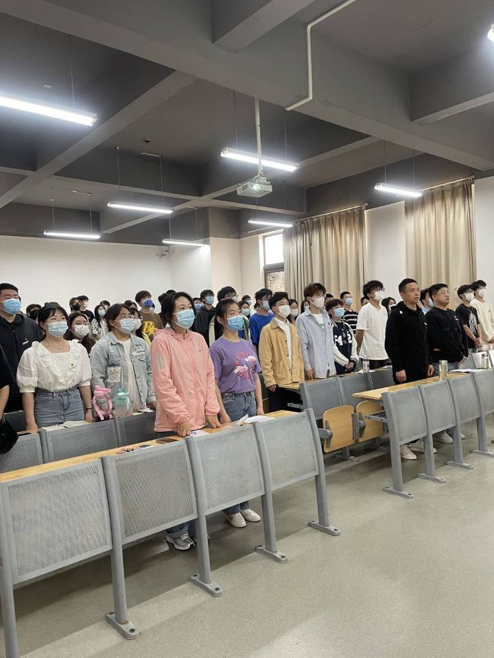 大会第一项,参会人员全体起立,奏唱《国歌》与《共青团团歌》。当国歌、团歌奏响时,全体参会学员为加入中国共产主义青年团而感到无比光荣,同时也感受到新时代青年肩上责任之重大。面对这百年未有之大变局,同学们表示会坚决拥护中国共产党的领导,解放思想,实事求是,与时俱进,积极推动社会主义建设,为全面建设小康社会、加快推进社会主义现代化贡献智慧和力量。