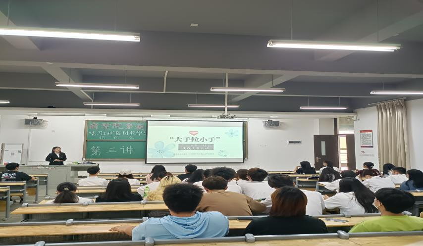 团课第二阶段,“大手拉小手”实践团负责人杨逾卢向参会人员介绍“大手拉小手”公益活动。她所组织的“大手拉小手”乡村支教活动曾获得了校级及省级认可,支教队伍通过到武汉市蔡甸区渔樵村和当地的小朋友一起生活、一起学习、一起玩耍,利用学生暑假的每个工作日上午,集中开展学业指导,以辅导暑假作业为主,同时也开展音乐、舞蹈等兴趣课程、手工制作等特色课程,与小朋友们一起分享艺术的奥秘和乐趣。在介绍完后,杨逾卢同学简单介绍了公益活动的报名方式,并以视频的形式展现“大手拉小手”的活动内容,参会学生聚精会神地观看这项意义非凡的支教短片。最后,杨逾卢同学呼吁大学生将已学的知识运用到乡村支教活动中,施才于社会志愿活动,度过一个有意义的、不一样的夏天,让暑期生活多姿多彩。