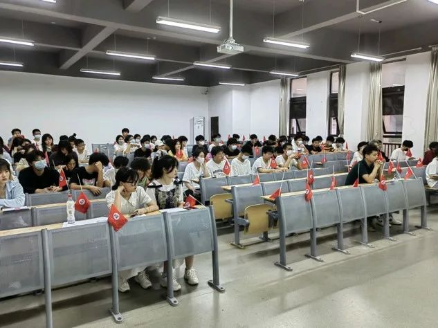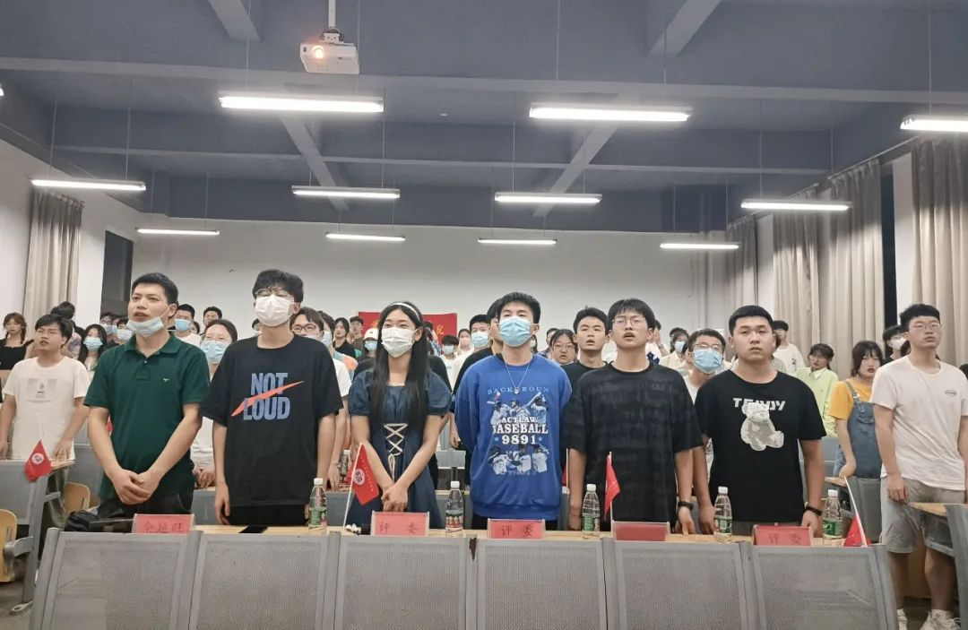 团总支书记余延旺老师出席了本次结业典礼活动,计算机学院组织部和团校培训班全体学员共计接近100人参会。教室座位上布置了学院特制的小院旗,讲台上也贴上醒目的党旗和团旗,整个现场井然有序,营造了一丝庄严肃穆的氛围。大会第一项和第二项,全体起立,分别奏唱国歌和团歌。