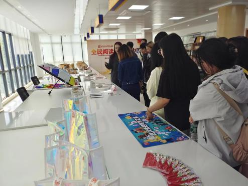 在书籍的左侧便是青年之家的文创产品,为契合青年群体的思想、兴趣和习惯,青年之家组织各高校创作了系列周边文创产品,有定制的赛博朋克风格的飞盘,建党一百周年主题绘画瓦片,手工作品,剪纸等。为了激发青年的创作动力,青年之家制定了积分管理办法,鼓励青年参与各类活动获取积分,兑换文创产品,激发青年参与活动的积极性。
