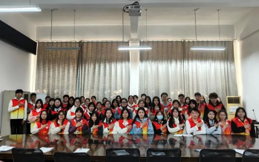 在庄严宣誓仪式上,全体成员身着统一志愿者服装,在优秀志愿者代表刘正宇同学的带领下,面向队旗,誓言定将恪守志愿服务规范。