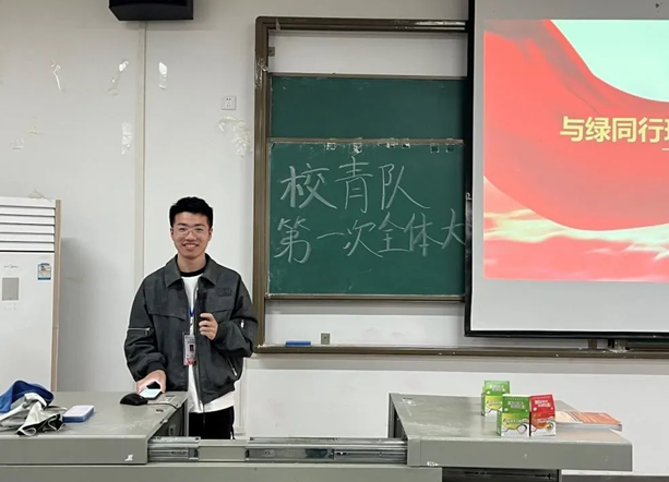 接下来由副队王呈睿进行发言。主要介绍了第七届“与绿同行”微公益环保创意大赛的内容,并积极动员校青队成员们参与比赛,积累更丰富的实践经验;在践行环保创新的同时,增强志愿服务荣誉感。